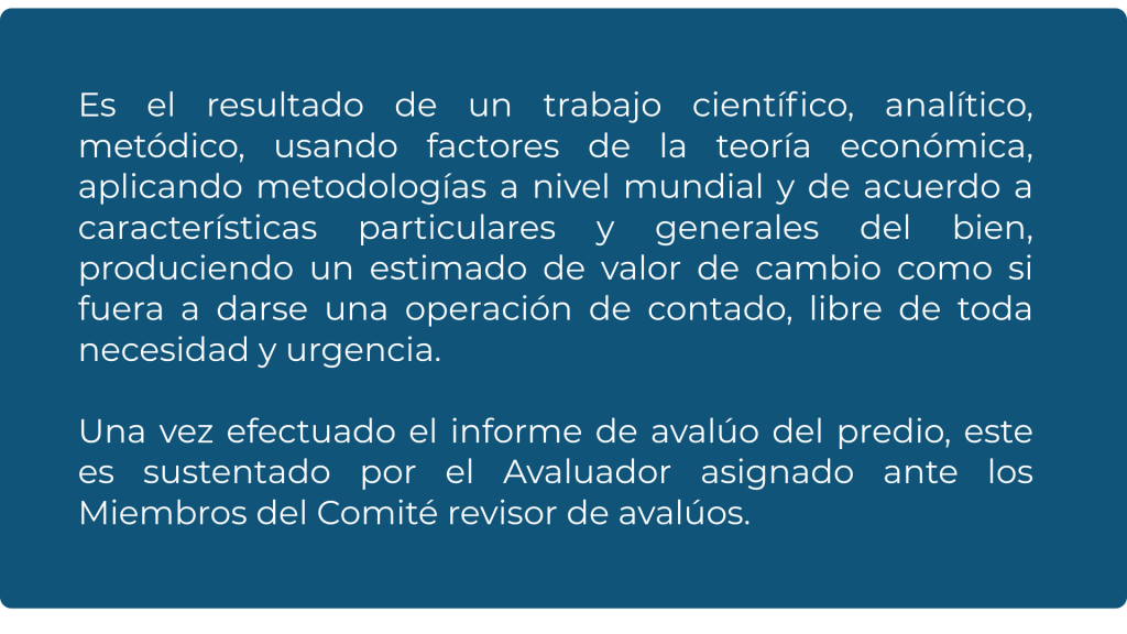 Proceso mediante el cual se determina el valor real de un inmueble en el mercado. Es solicitado para venta, compra, renta, compensaciones, garantías bancarias, procesos administrativos o toma de decisiones patrimoniales, brindando un valor confiable y técnicamente sustentado.