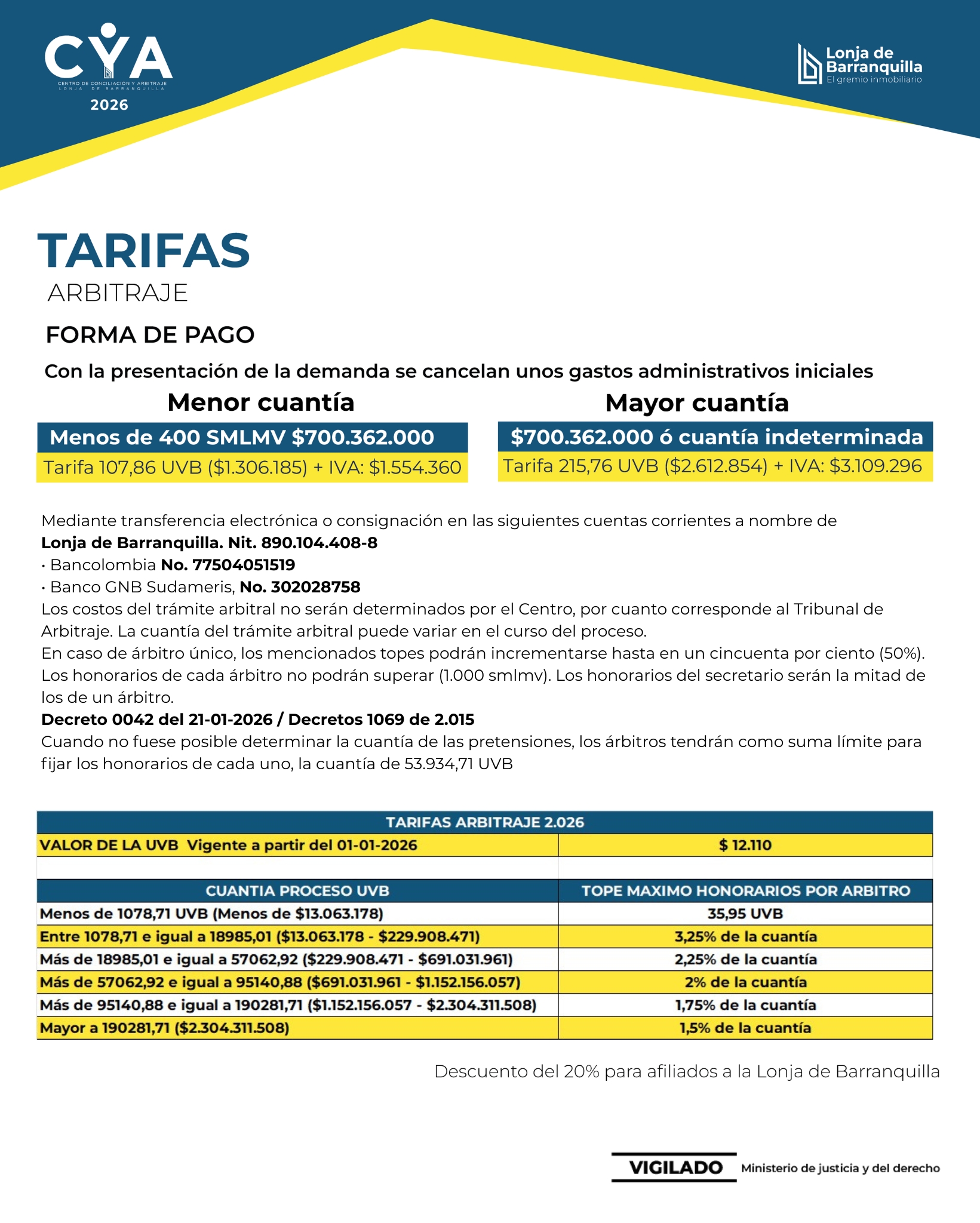 Conforme con la normatividad vigente (Decreto 0042 de 2026), el Centro aplica las siguientes tarifas y forma de pago, tomando como base la cuantía de las pretensiones o el valor de las diferencias objeto del conflicto. La tarifa comprende gastos administrativos y honorarios del conciliador, más el respectivo IVA.