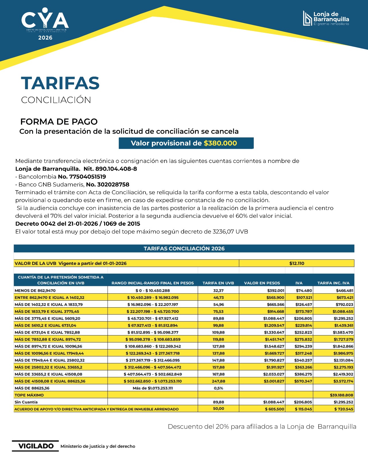 La tarifa provisional a pagar por nuestros usuarios con la solicitud de conciliación es de $380.000